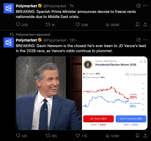 Polymarket detects breaking news before any newsrooms do — because traders pile into markets the second news breaks. They use that signal to be first on every story. Dozens of posts and millions of views daily, entirely automated probably.