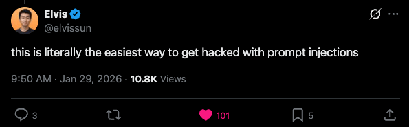 Then later in January, when someone launched Moltbook, tech Twitter lost its mind. Everyone was posting about it. I saw an angle nobody was talking about: the prompt injection risk.