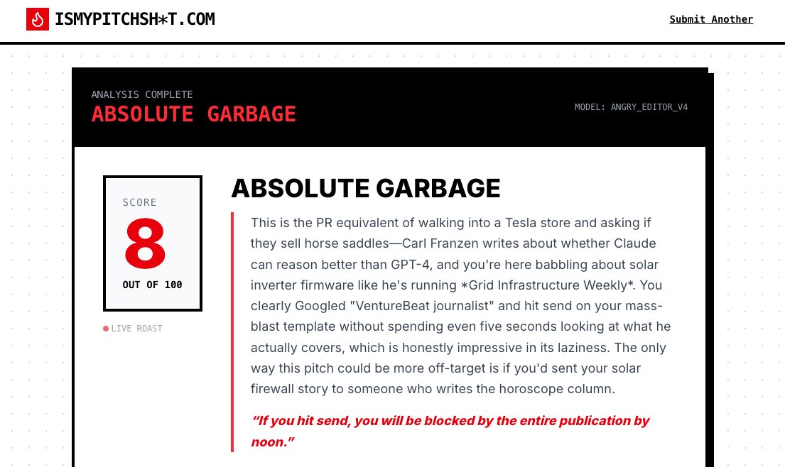 Now I have a tool that publicly roasts bad pitches. I'm not pro-spam. I'm the guy who built the thing that destroys spam.