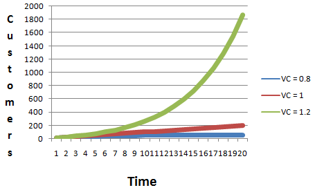 If VC is 1.1, it compounds exponentially. (It means 1 user will bring more than 1 other user) But if VC is 0.9, your product slowly dies.